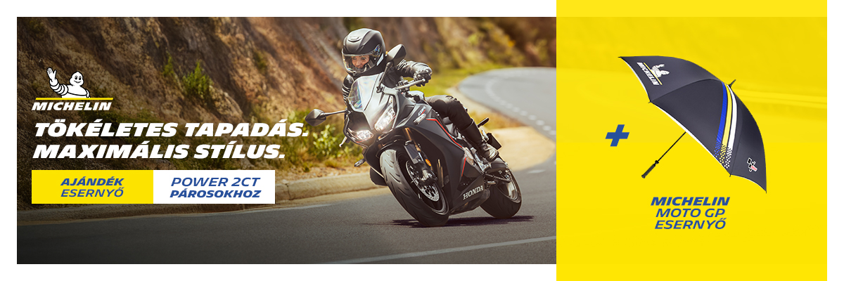 Most pedig még egy fokkal különlegesebb ajánlattal várunk: Ha egy pár (első + hátsó) Michelin Power 2CT gumit rendelsz, mi egy Michelin MotoGP esernyőt adunk mellé ajándékba a készlet erejéig!